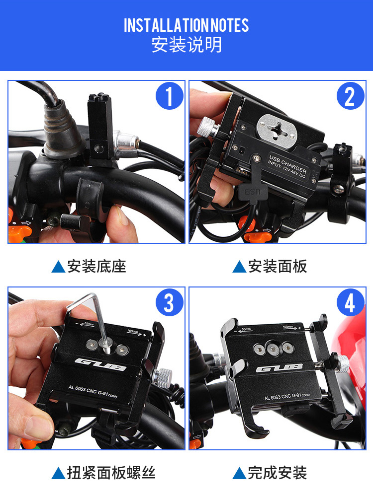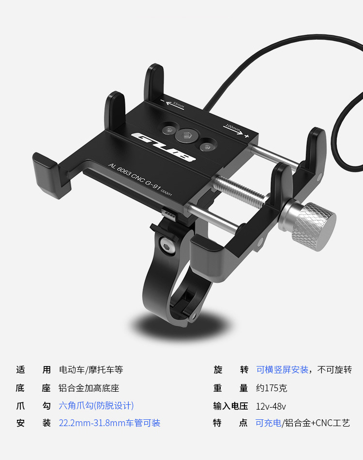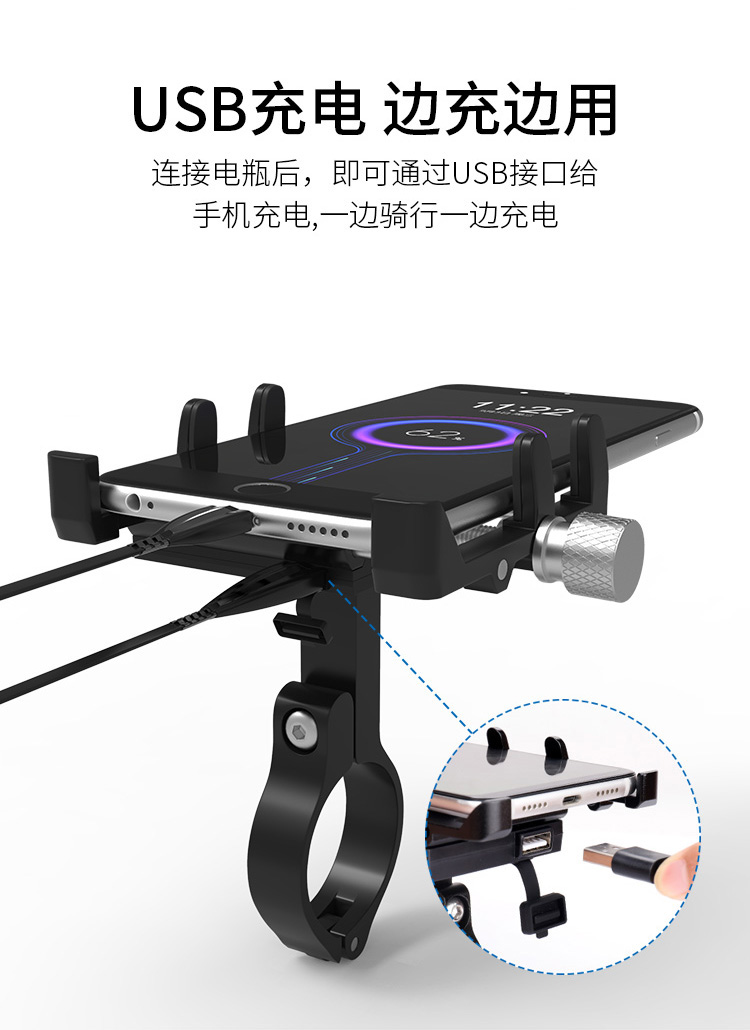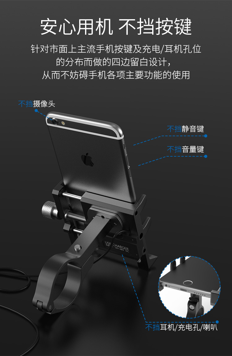 特點(diǎn):全鋁合金架體,四對位加長固定部+強(qiáng)化底托,更標(biāo)配穩(wěn)固綁帶,高兼容性不挑手機(jī)型號,連接電瓶后可為手機(jī)充電,摩托車/電動車等都可使用!