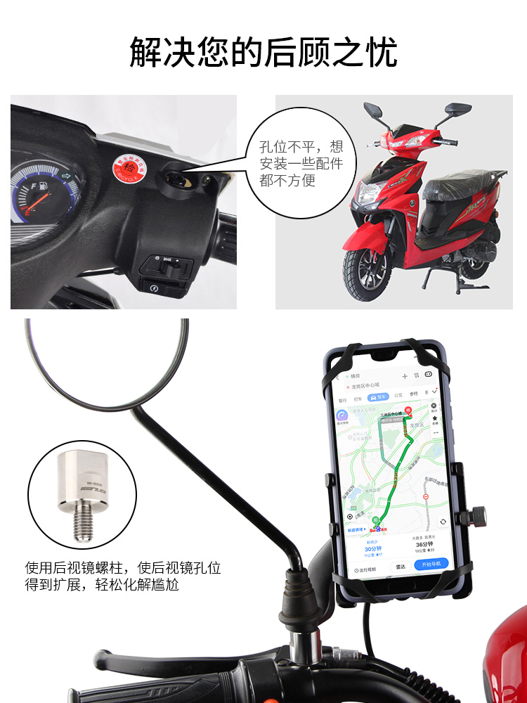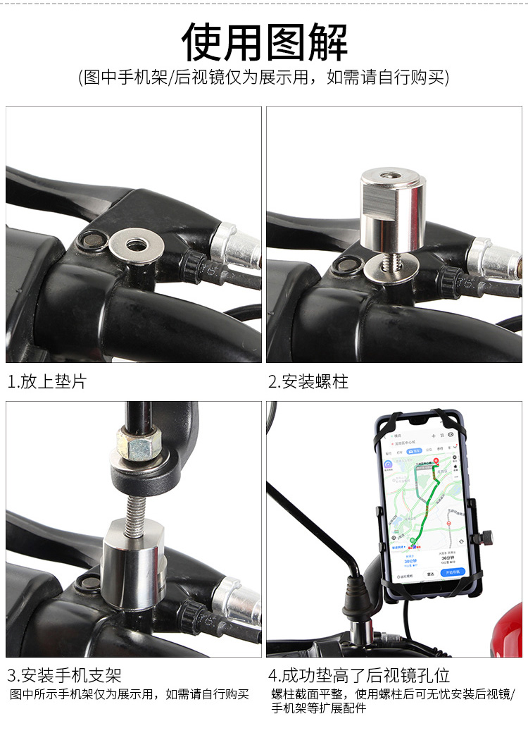 簡介:此配件為后視鏡輔助配件,采用不銹鋼材質(zhì),耐用不生銹,用于摩托車/電動(dòng)車后視鏡孔位的擴(kuò)展,起到墊高或更好適配的作用。