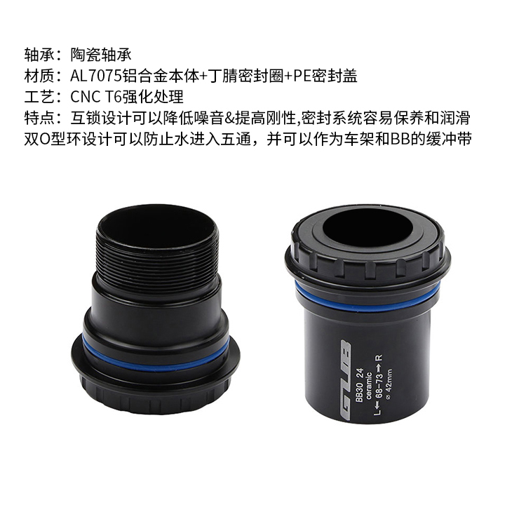 適合車架五通內徑:42mm ,五通寬度:68mm-73mm ,兼容SHIMANO (24mm-24mm)/SRAM(24mm-22mm)軸心牙盤