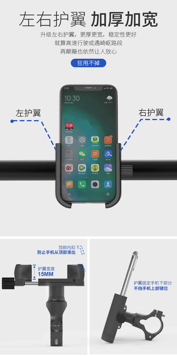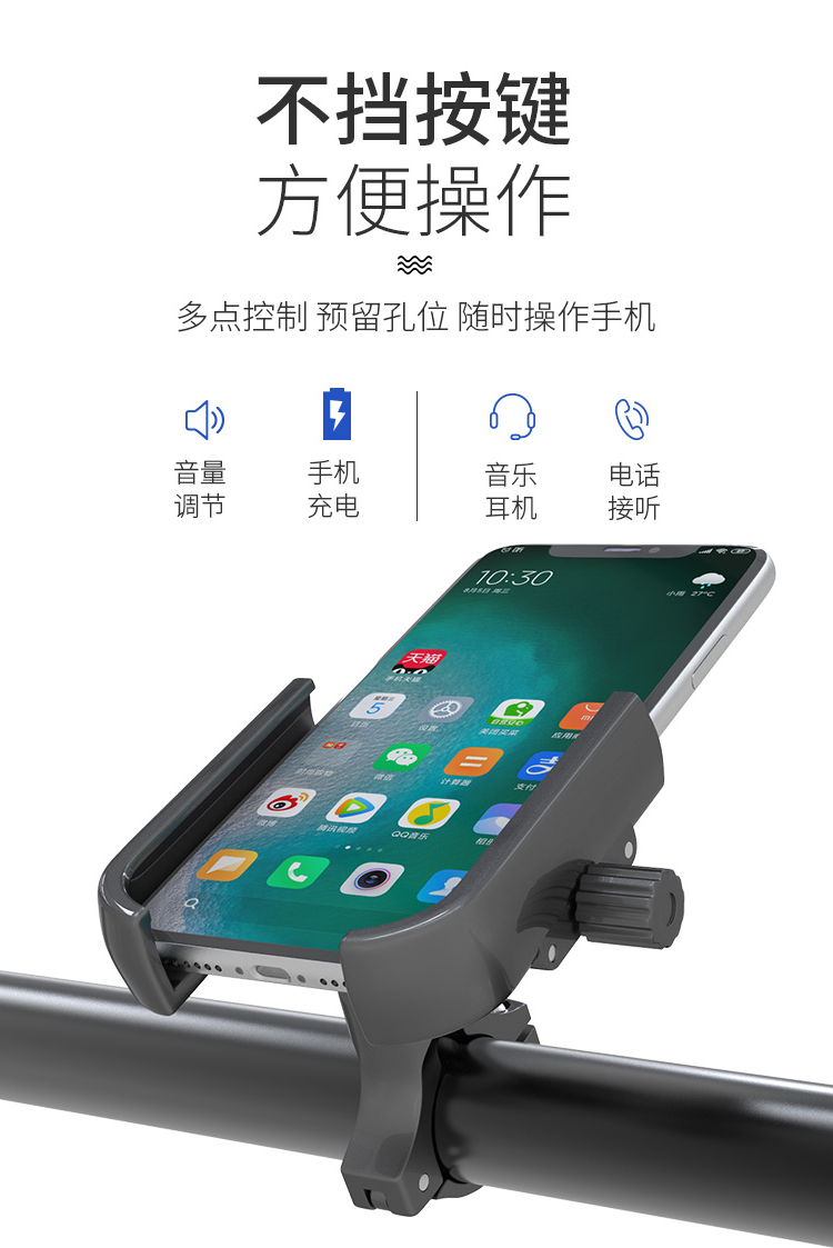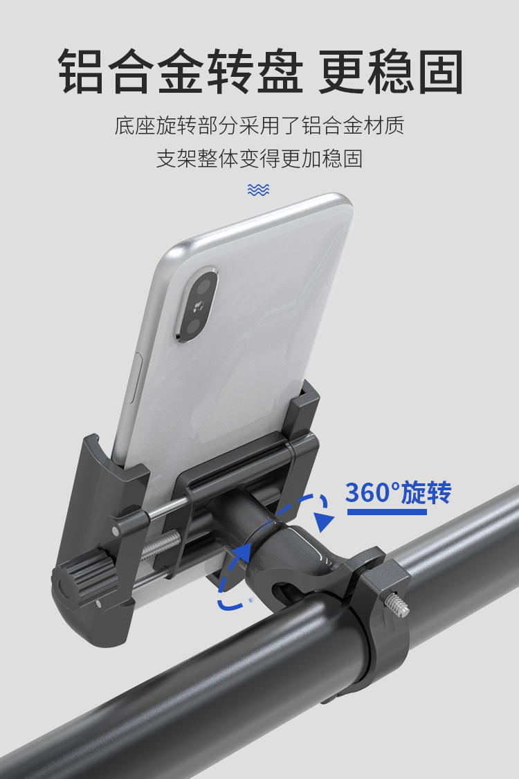 特點:全鋁合金架體,加厚加寬使用更安全。免工具平面360度旋轉(zhuǎn),高兼容性不挑手機型號,自行車、電動車等都可使用!
