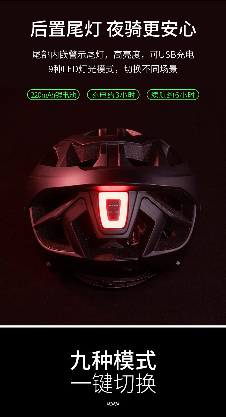 特色:帶USB充電尾燈(九種模式),一體成型,造型時尚,多通風孔設(shè)計,多色可選。