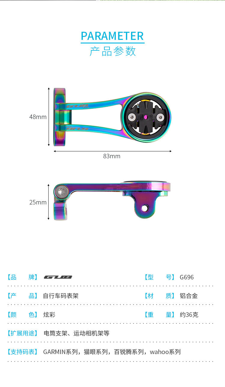 配置:配運動相機轉(zhuǎn)接座,wahoo、佳明、百銳騰和貓眼碼表接座