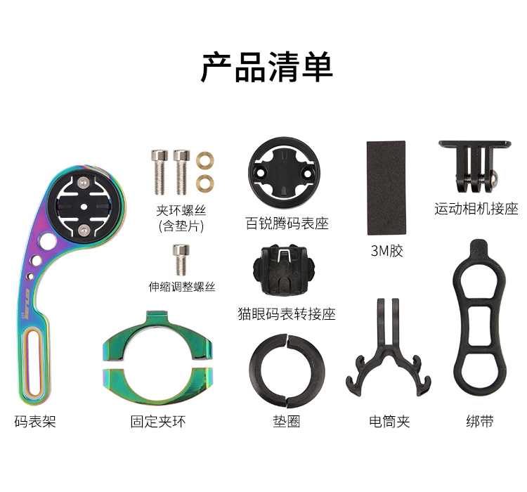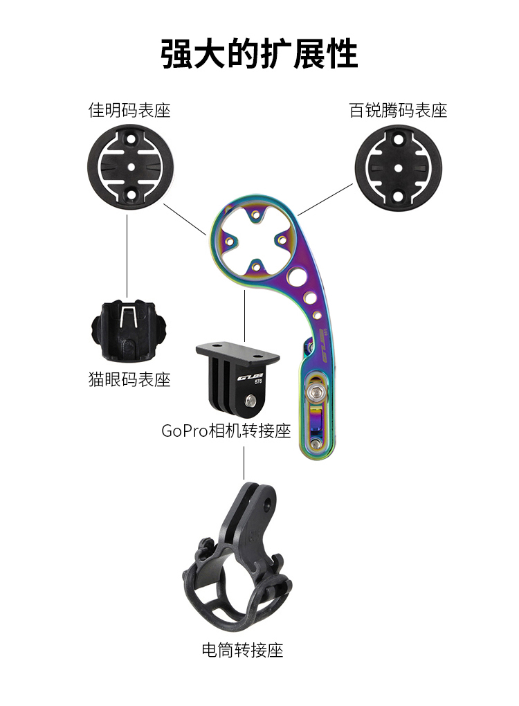 安裝在車把上,可伸縮設(shè)計,兼容佳明碼表,使用附帶的配件可兼容百銳騰碼表、貓眼碼表,另標(biāo)配運動相機轉(zhuǎn)接頭和電筒轉(zhuǎn)接頭。