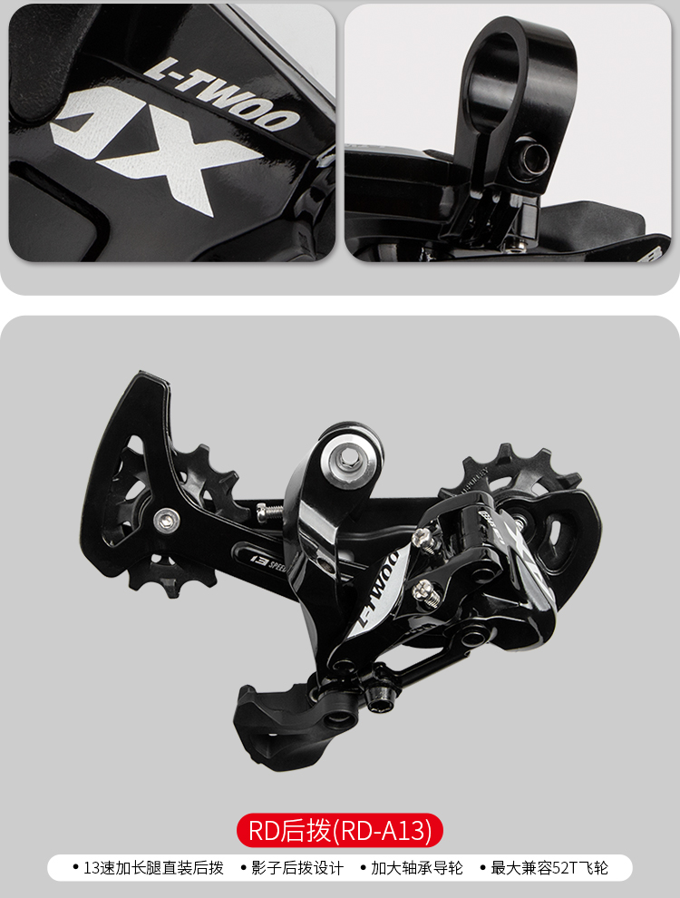 后撥:13速加長腿直裝后撥,影子后撥設(shè)計(jì),加大軸承導(dǎo)輪,最大兼容52T飛輪