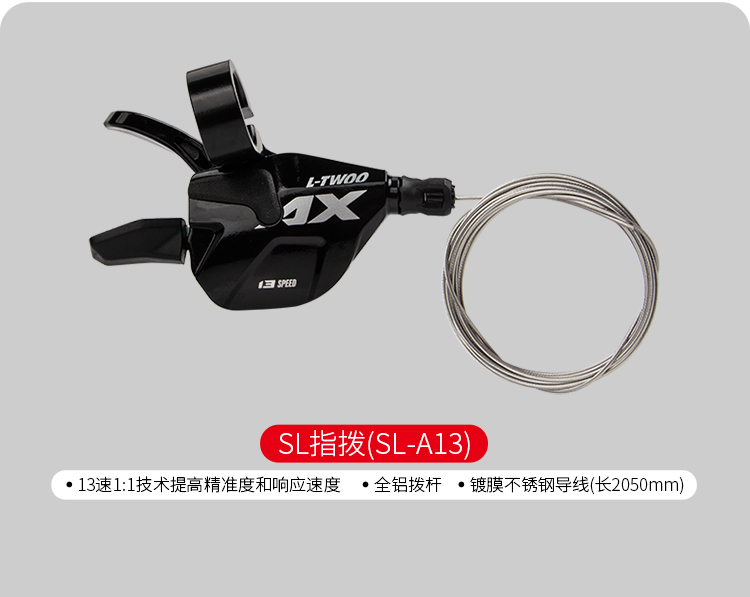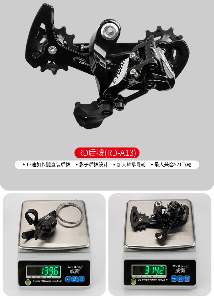 后撥:13速加長腿直裝后撥,影子后撥設(shè)計(jì),加大軸承導(dǎo)輪,最大兼容52T飛輪