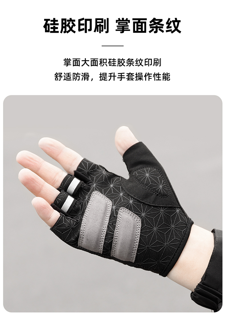 特點:簡約設計、貼合手掌,手背高彈透氣面料,手掌大面積硅膠印刷條紋,防滑效果好