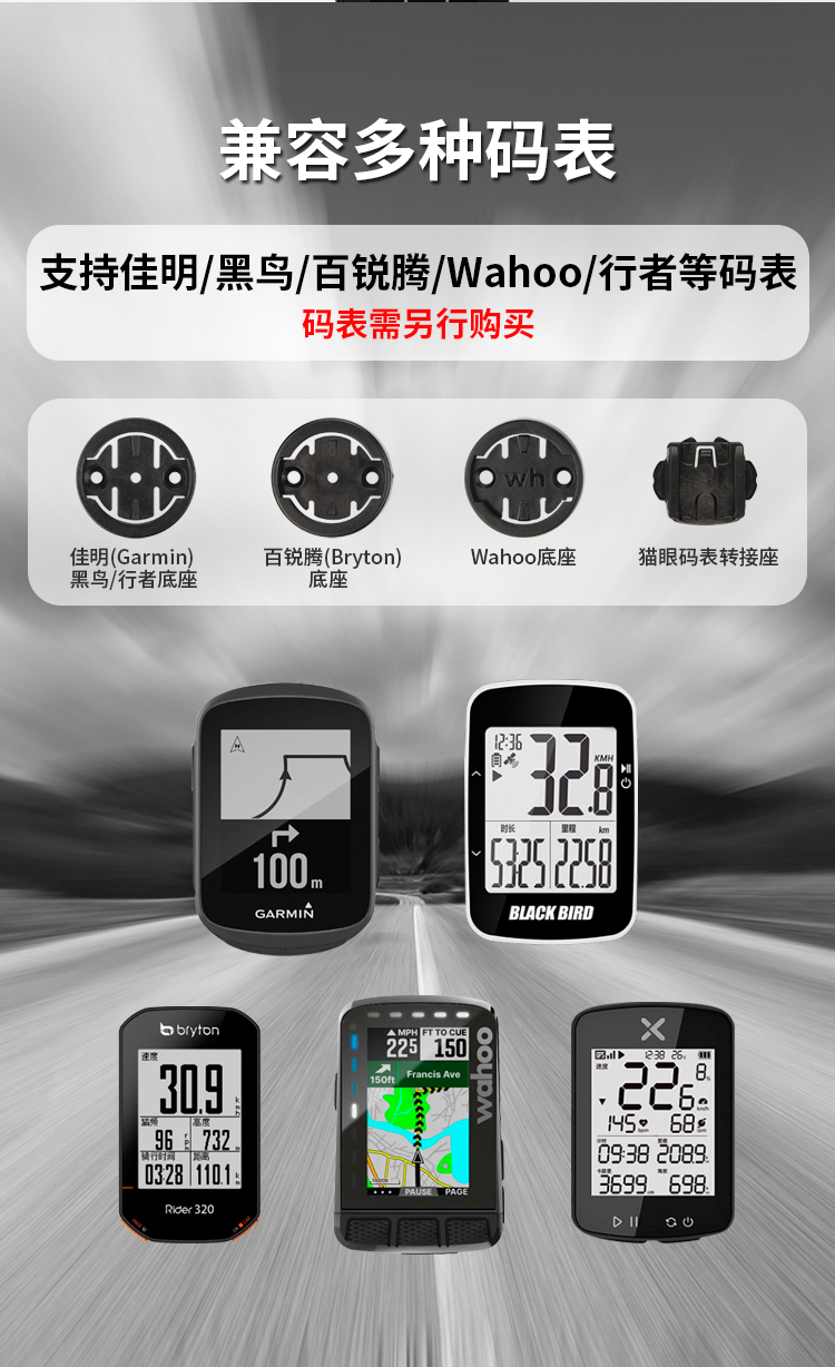 支持碼表:GARMIN全系列(兼用行者/黑鳥/iGPS等),貓眼全系列,WAHOO系列,百銳騰系列
