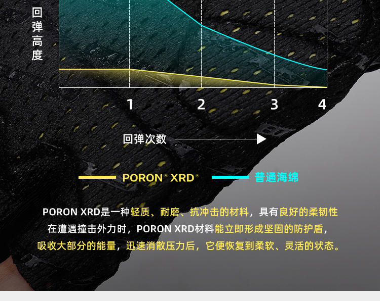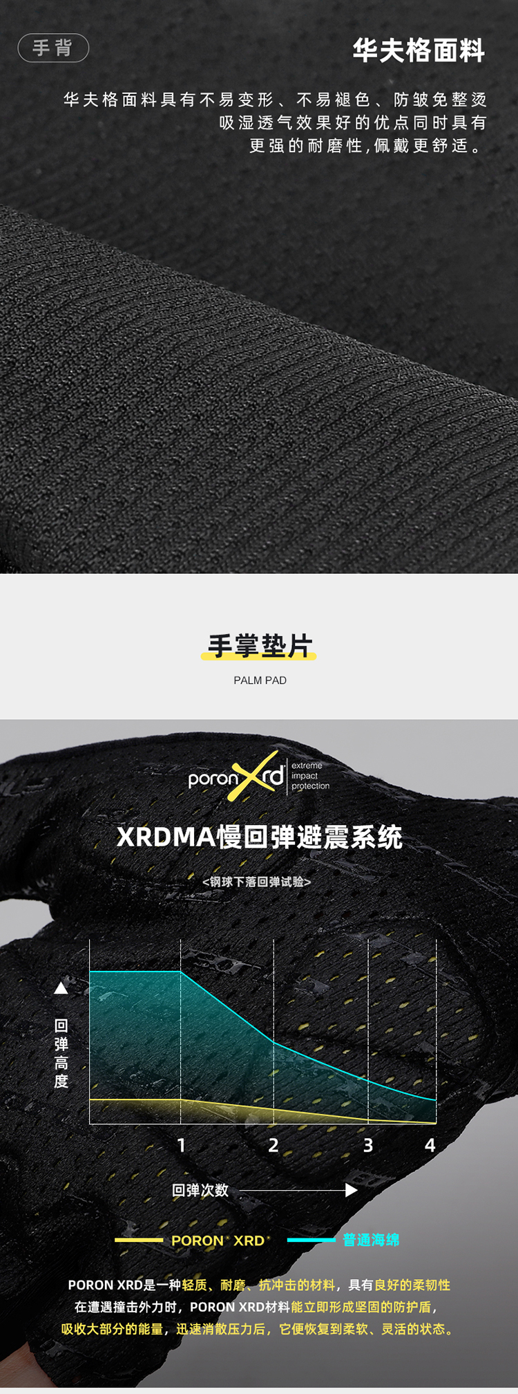 材質(zhì):華夫格高彈透氣面料、進(jìn)口PORON XRD 緩沖掌墊、掌心采用仿生科技網(wǎng)眼、韓國(guó)Aerosilver抗菌面料(擦汗布)