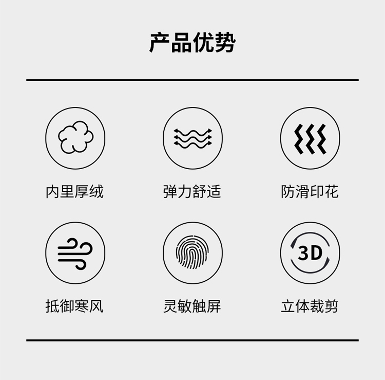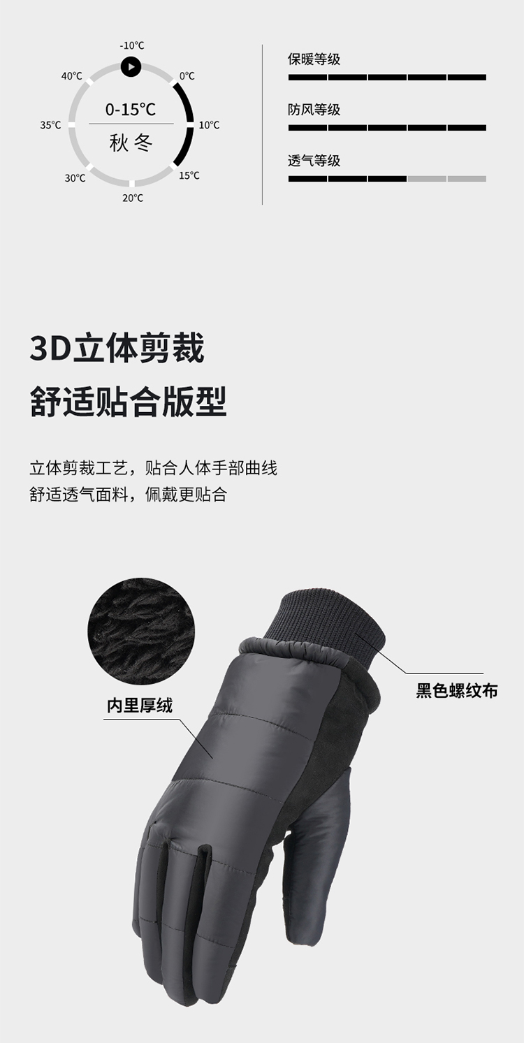 特點:內(nèi)里加絨,抵御寒風,柔軟舒適,3D立體裁剪,防滑耐磨