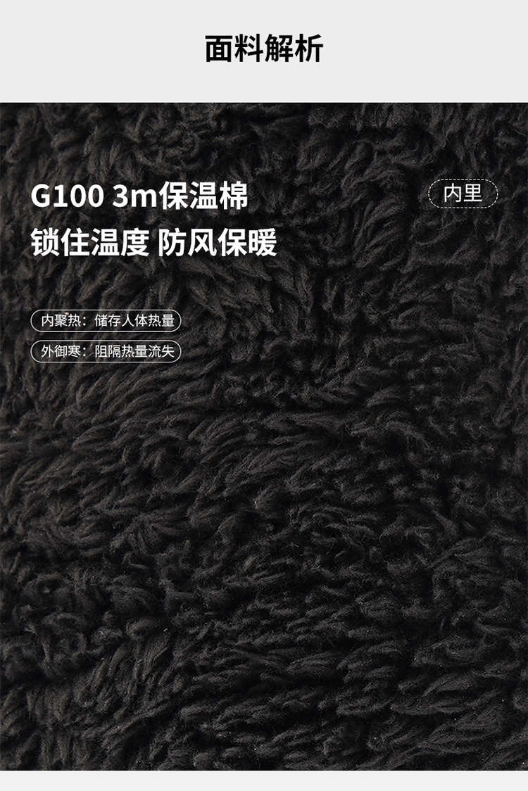 材質(zhì):20D尼龍油光布、G100 3m保溫棉、黑色仿皮絨