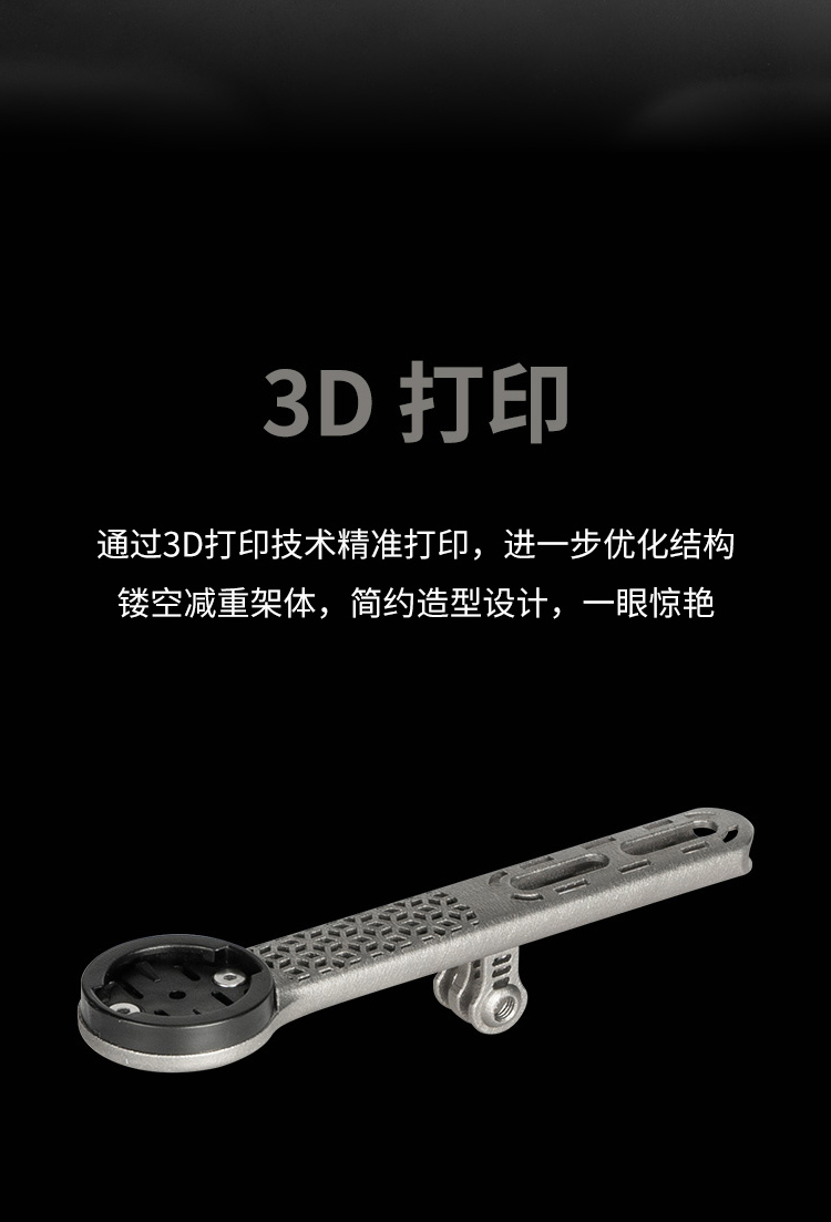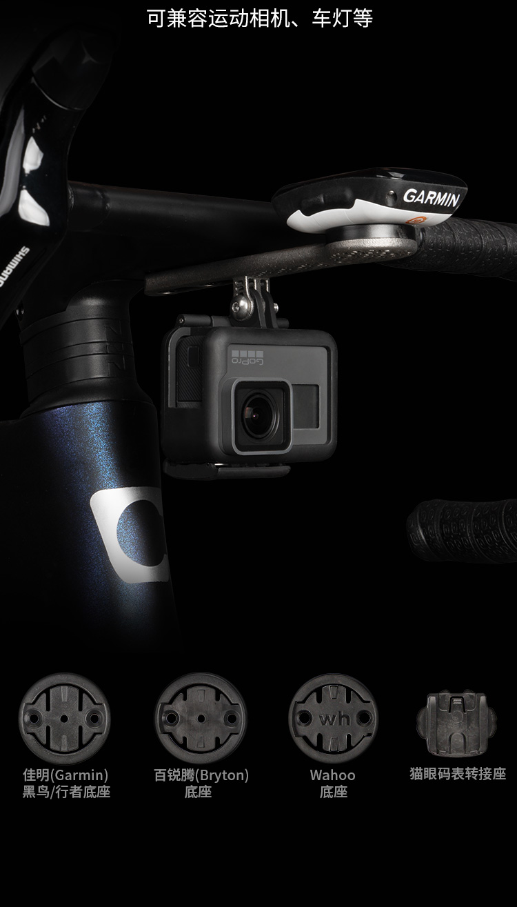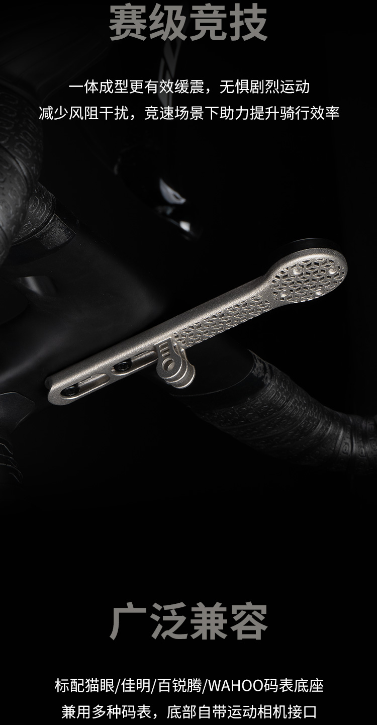特點:鈦合金架體,3D打印工藝,居中安裝節(jié)省空間(一體把專用),兼容多種碼表,標(biāo)配運(yùn)動相機(jī)接座,可擴(kuò)展使用運(yùn)動相機(jī)等配件