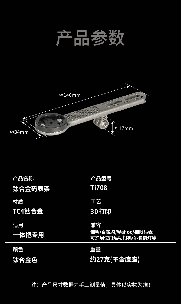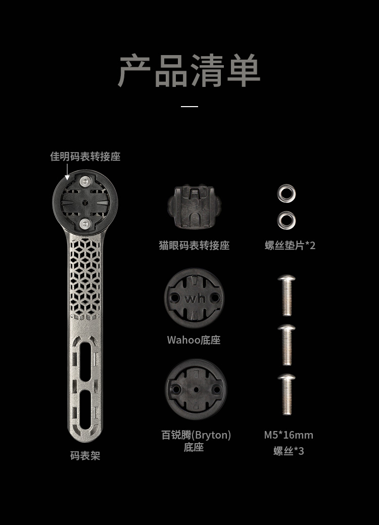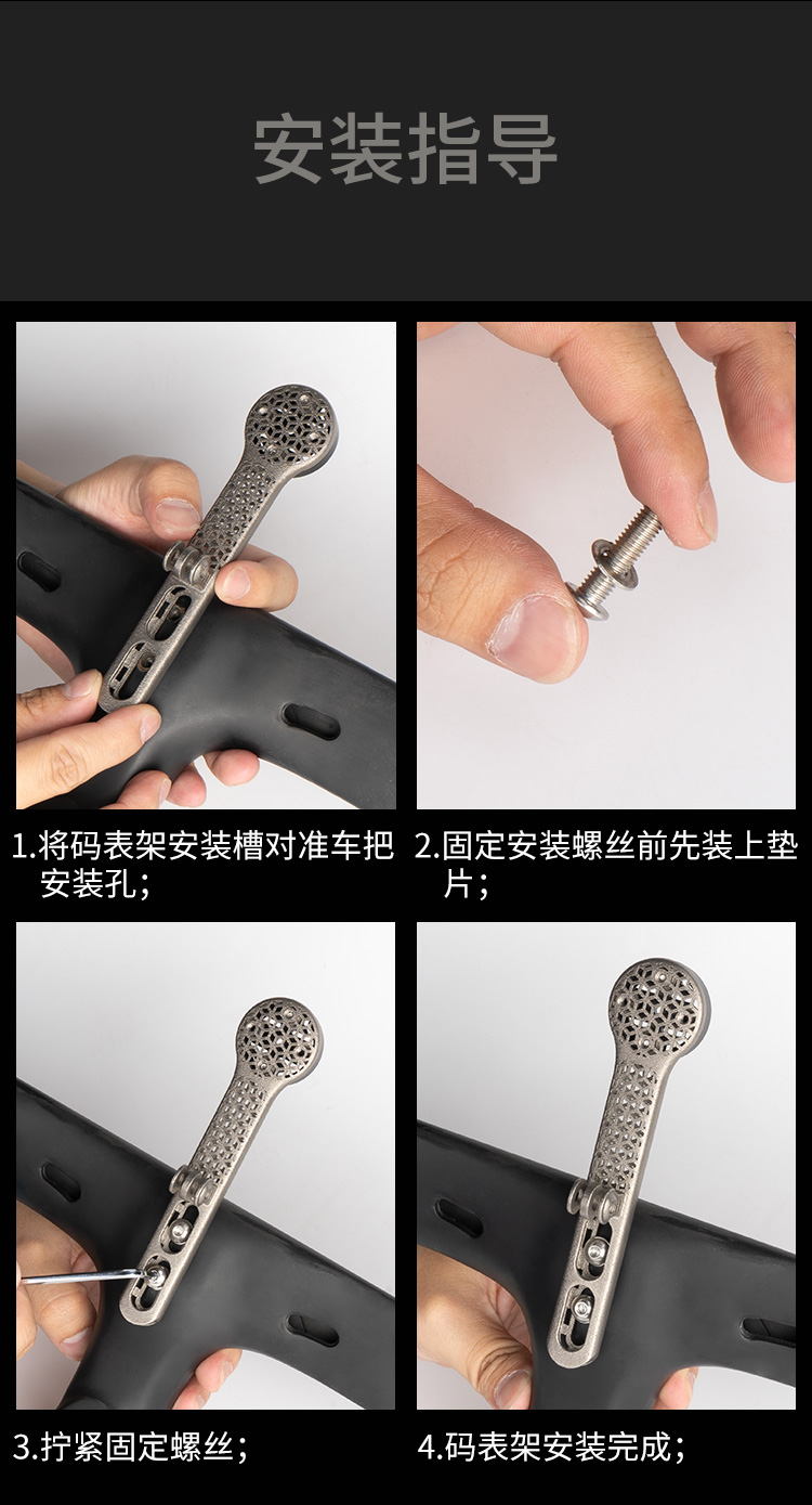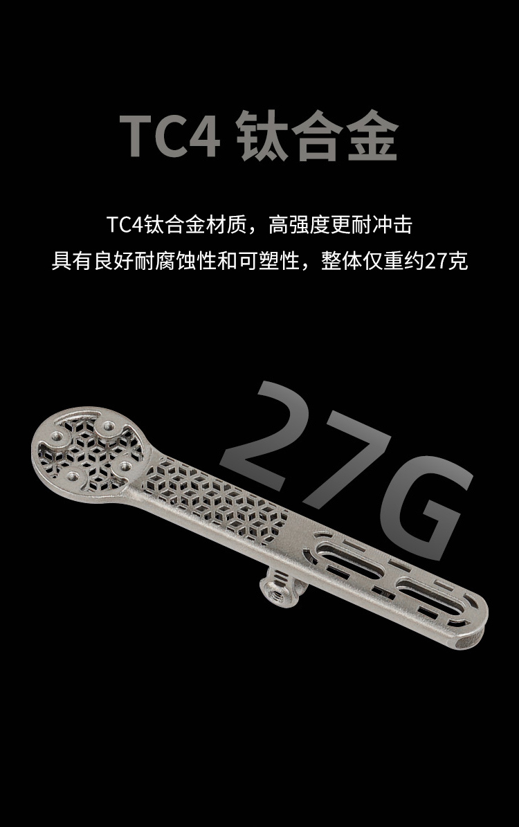 特點:鈦合金架體,3D打印工藝,居中安裝節(jié)省空間(一體把專用),兼容多種碼表,標(biāo)配運(yùn)動相機(jī)接座,可擴(kuò)展使用運(yùn)動相機(jī)等配件
