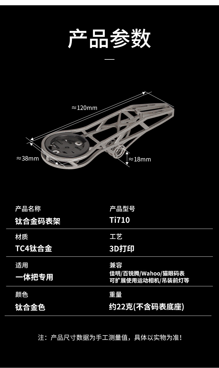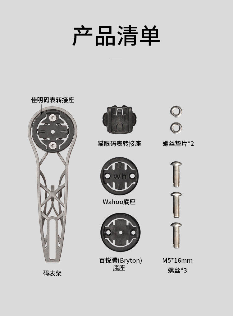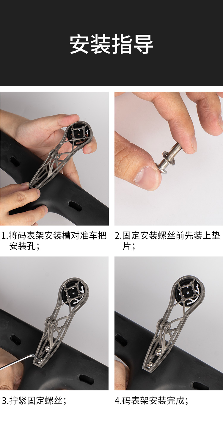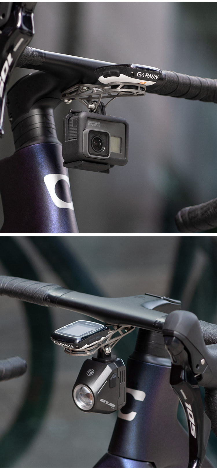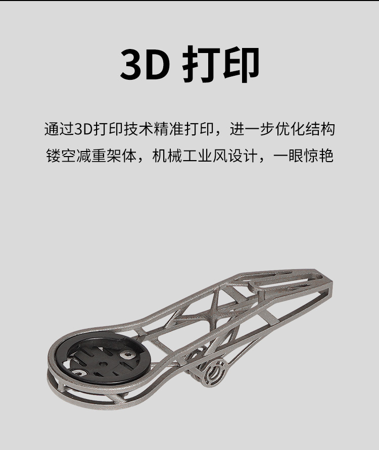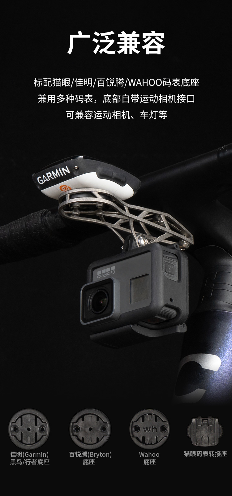 特點:鈦合金超輕架體,3D打印工藝,居中安裝節(jié)省空間(一體把專用),兼容多種碼表,標(biāo)配運(yùn)動相機(jī)轉(zhuǎn)接座,可擴(kuò)展使用運(yùn)動相機(jī)等配件